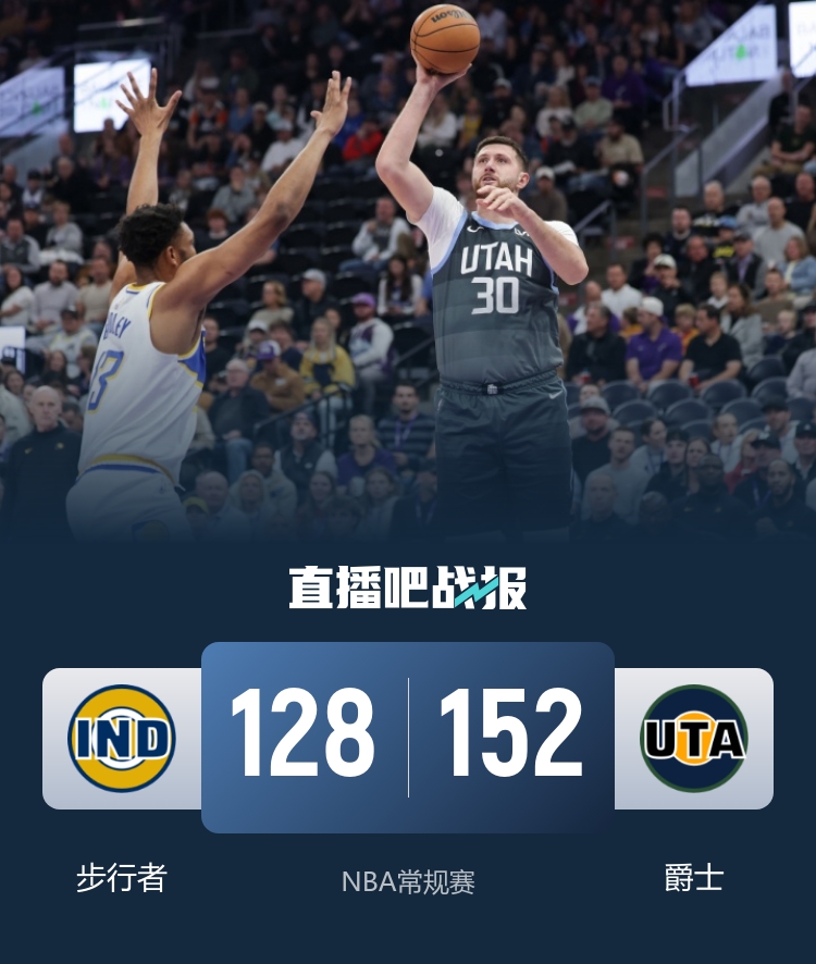 比赛开始,步行者反客为主上来轰出10-0开局,爵士迅速回应8-0咬住比分,双方展开对攻,马尔卡宁里突外投助爵士首节反超4分,次节步行者突然断电,爵士轰出12-0一举建立双位数领先,贝利压哨补篮帮助爵士半场领先13分。下半场,马尔卡宁手感火热,接连外线三分迅速砍下11分扩大领先,随后爵士外线各种发炮直接拉开20分领先,末节爵士持续发力牢牢掌握住20分左右领先,步行者无力回天,最终爵士152-128大胜步行者,终止3连败同时送对手5连败。
