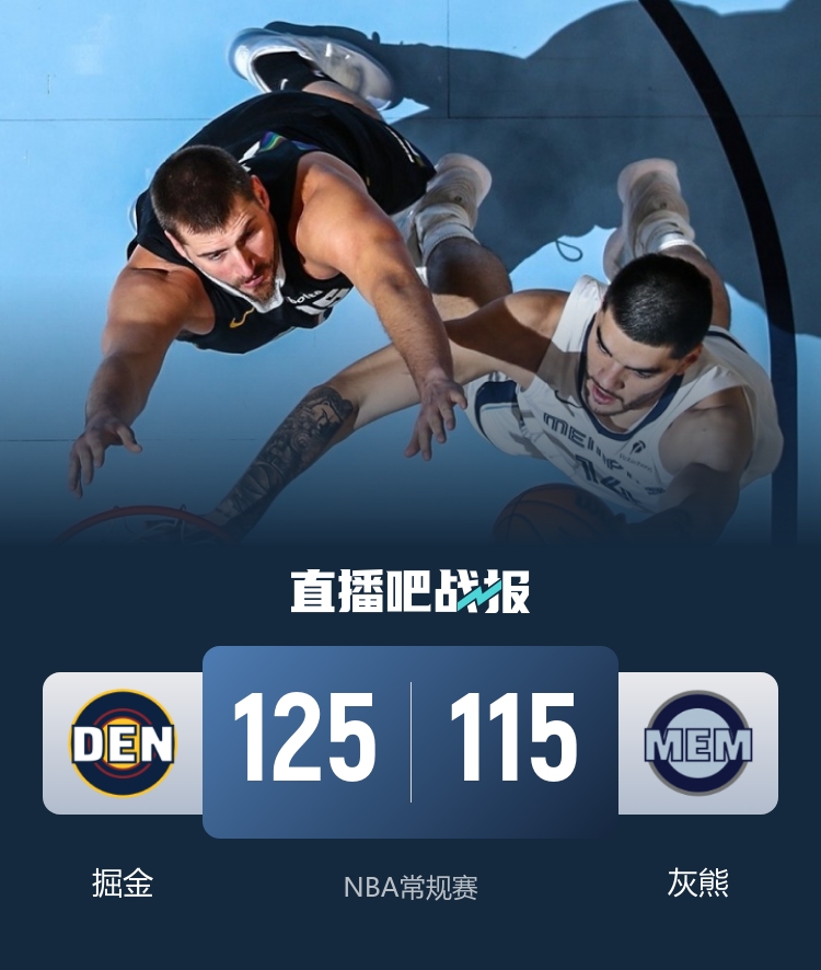 首节开打后两队迅速陷入僵持,灰熊内外结合多点开花,穆雷外线强势回应,约基奇组织得分一把抓,掘金末段发力后来居上,首节结束时掘金领先4分,次节回来,灰熊进攻感觉回暖,但掘金延续火力总能回应,半场战罢,掘金已经领先8分。短暂休整后沃特森突然爆发单节飚中4记三分,约基奇中场超远压哨三分命中,三节结束后掘金保持8分优势,末节上来,灰熊没有放弃继续追分,掘金主力回归后收割比赛,最终掘金125-115击败对手重返西部第二。