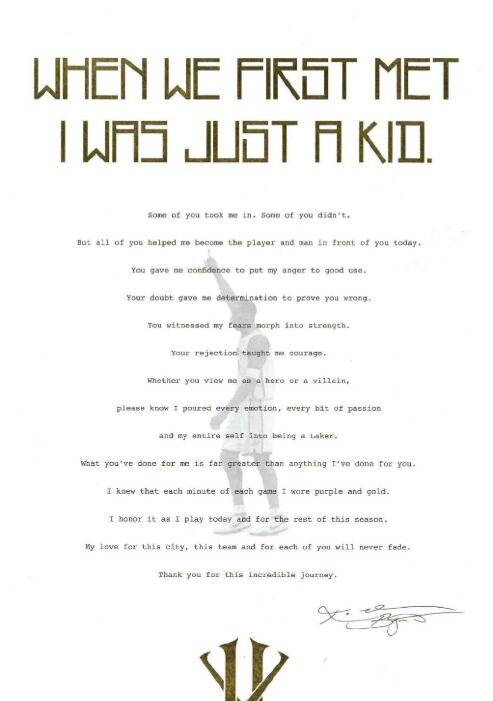 “这个赛季已经是我最后能倾尽的全部了。”科比在信中写到,“我的心还能够接受打击,我的意志还能让我继续坚持,但我的身体知道是时候说再见了。没关系,我已经准备好了。”