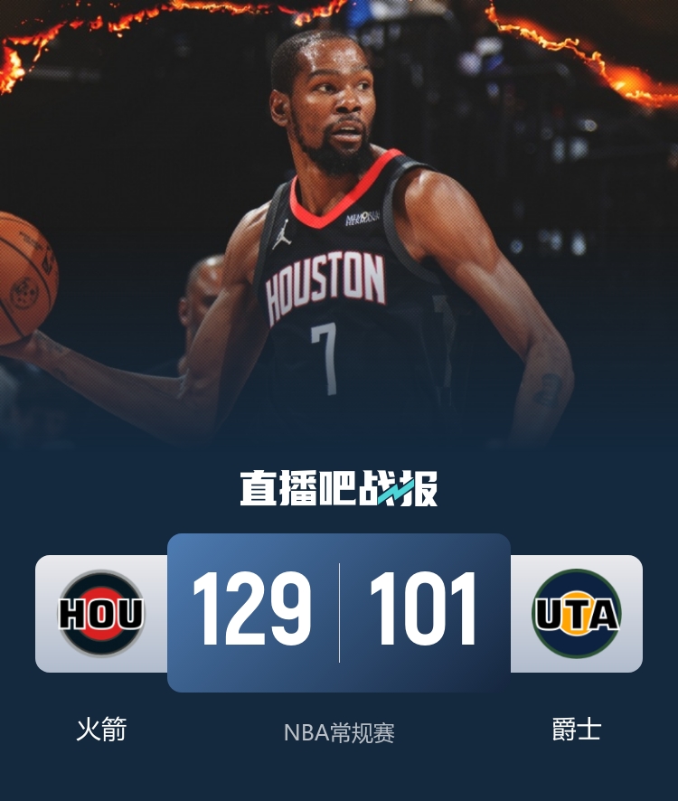 火箭(13-4):申京27分4板5助、杜兰特25分6板4助3断、史密斯15分2板3助、亚当斯13分12板2助、霍勒迪11分1板2助、谢泼德9分6板4助4断2帽、奥科吉7分5板、泰特7分2板2助、卡佩拉6分4板2帽、阿门5分8板9助、格林4分、戴维森1助