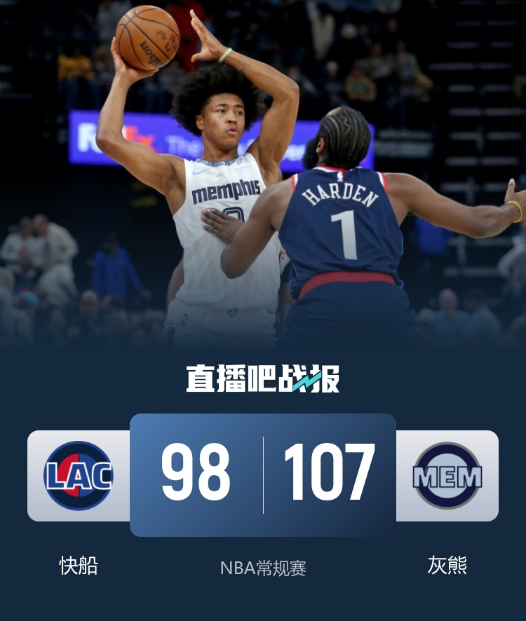 比赛开始,哈登高效输出,连中三分帮助球队占据场上主动,灰熊不断冲击内线拿分追赶,小卡三分命中,但灰熊奋力反击迅速迫近比分,次节双方继续缠斗,比分始终紧咬,小卡内外开花连续拿分,斯潘塞2记三分还以颜色,半场战罢快船58-54领先灰熊。易边再战,快船命中率下降,灰熊持续发力完成反超,巴图姆三分穿针稳住局势,末节双方争夺陷入白热化,关键时刻快船连续打铁失误,灰熊一波9-0锁定胜局。最终,快船98-107再负灰熊。