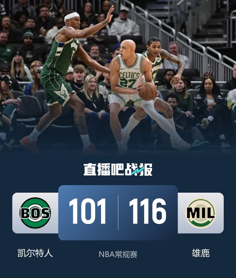 一开场,双方短暂相持,凯尔特人持续发力,内外开花打出14-2的攻击波取得领先,雄鹿及时回暖,特伦特和波蒂斯相继三分穿针帮助球队迅速迫近比分,凯尔特人外线开火连中三分保持优势,小波特和库兹马联手拿分,雄鹿不断蚕食分差,半场战罢凯尔特人67-60领先雄鹿。下半场,雄鹿占得先机,内外开花打出11-0的攻击波抹平分差,凯尔特人进攻端迟迟找不到感觉,波蒂斯三分带队反超,末节雄鹿8-2将分差拉开到两位数,凯尔特人毫无起色,雄鹿一波12-2将分差拉开到20分以上锁定胜局。最终,雄鹿116-101逆转凯尔特人,主场过关。