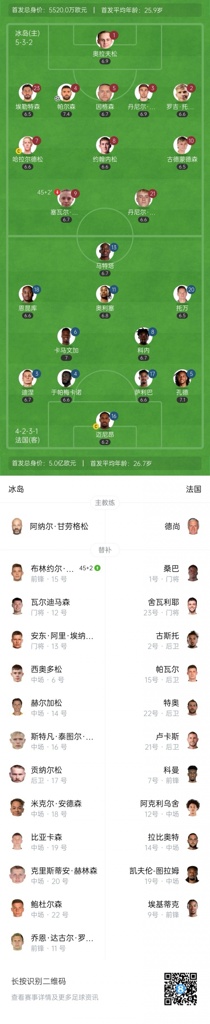 冰岛首发:1-奥拉夫松、23-埃勒特森、4-帕尔森、5-因格森、3-丹尼尔·利奥·格雷特森、2-罗吉·托马森、7-哈拉尔德松、8-约翰内松、10-古德蒙德森、9-塞瓦尔·阿特利·马格努森、21-丹尼尔·古德约恩森