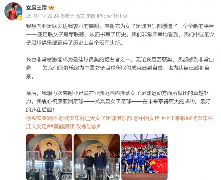 10月17日讯 亚足联年度颁奖典礼结束,王霜无缘年度最佳女足球员奖项。尽管如此,王霜仍在个人社交媒体发文致谢亚足联。