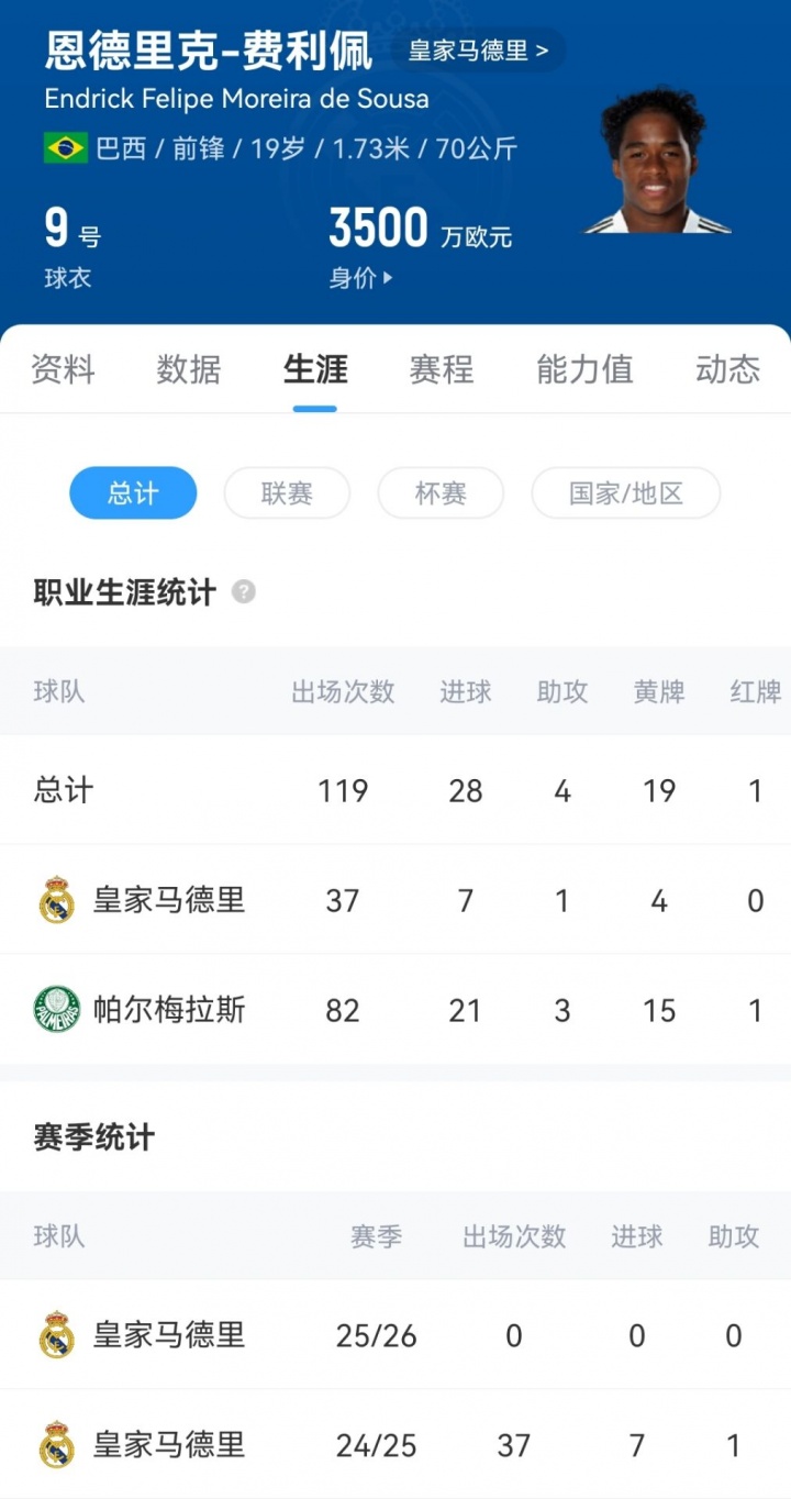 皇马在2024年夏天花费4750万欧引进恩德里克,上赛季恩德里克出战37次共计847分钟,贡献7球1助攻。恩德里克的德转身价从最高时的6000万欧跌到了3500万欧。