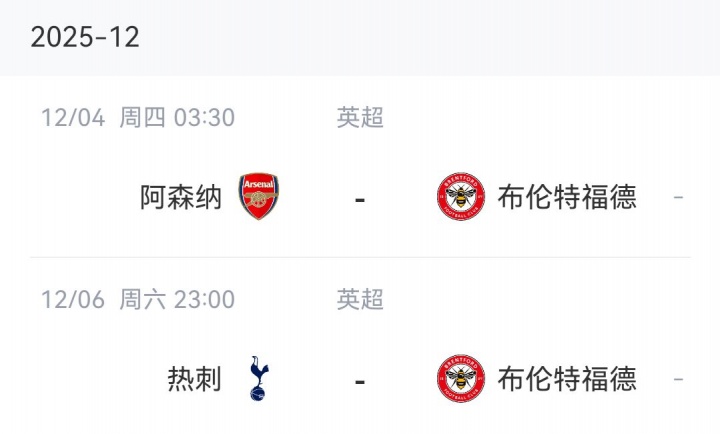 12月份的头两场比赛,布伦特福德将接连客场挑战BIG6的另外两支球队:阿森纳和热刺。