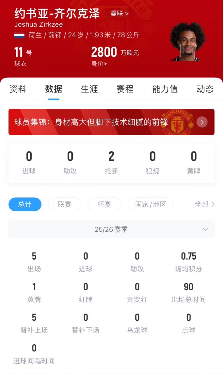齐尔克泽去年夏窗以4250万欧转会费加盟曼联,本赛季0球0助,目前德转身价2800万欧。